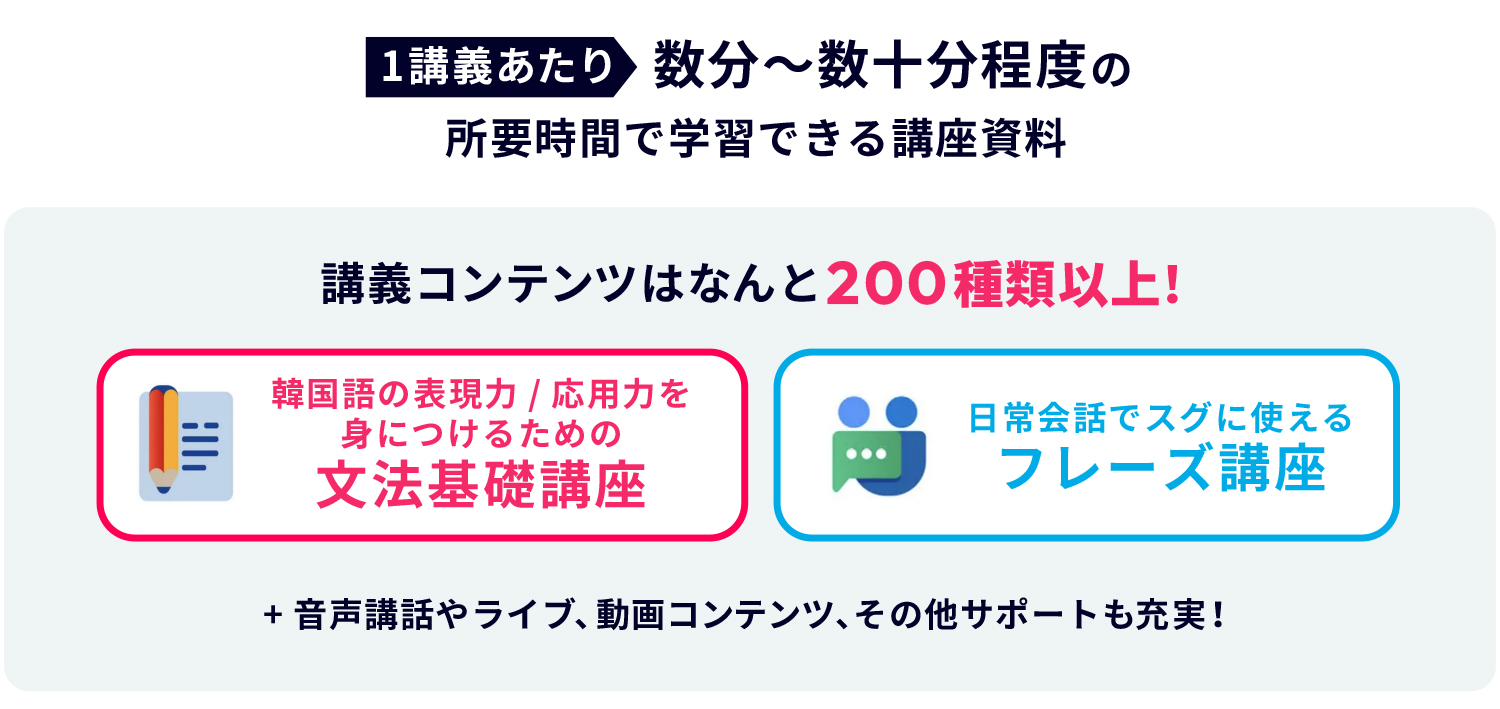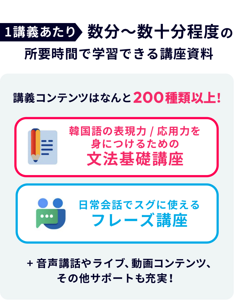 日々の学習も実践アウトプットもスマホ1つ、オンラインで完結!資料に関しては解説音声を聴きながら学べる学習スタイルです。発音音声は全てネイティブ韓国人のリアルな発音でお届けします。