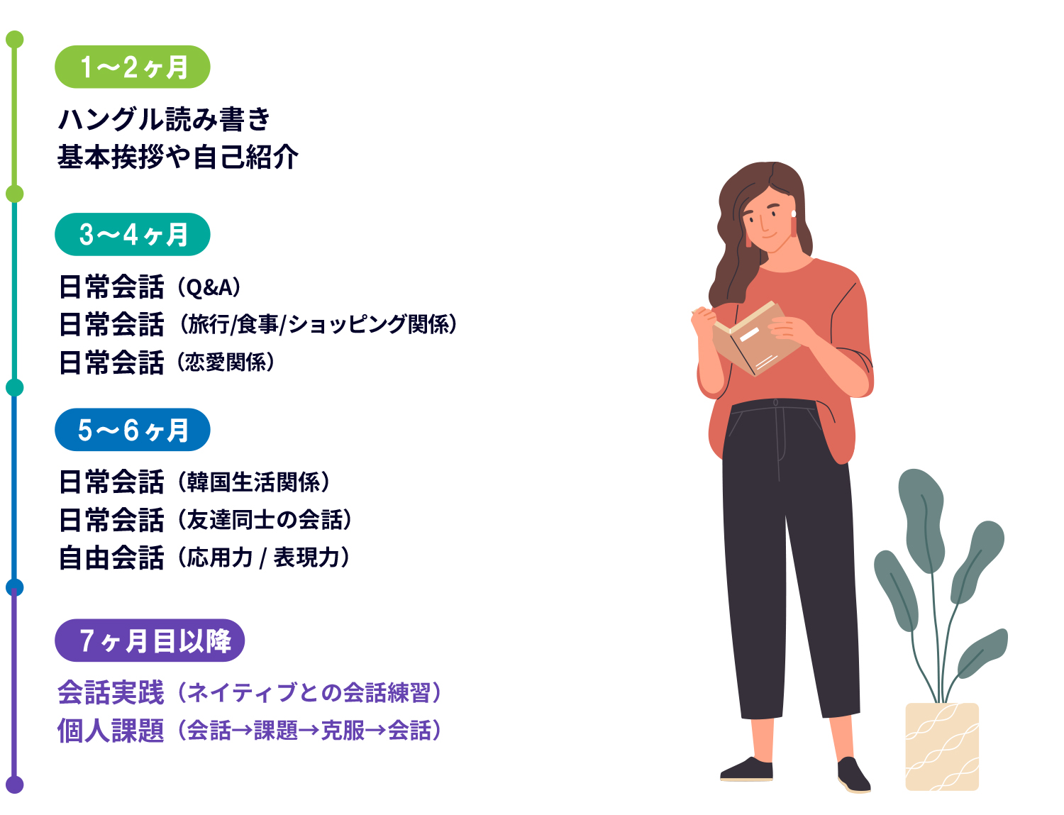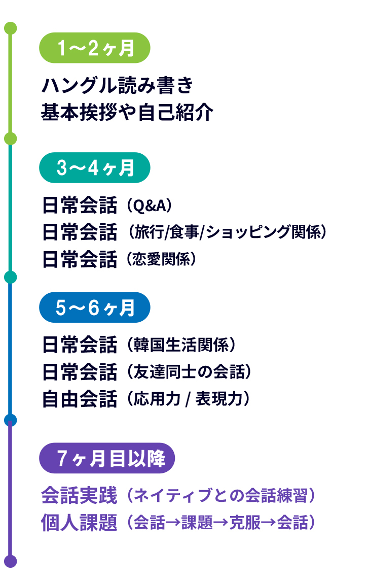 モンザップの講座運営は“無理なく自然に韓国語会話を習得する”を元に考えられています。つまり「楽しく継続する」ためのカリキュラム設計になっています。